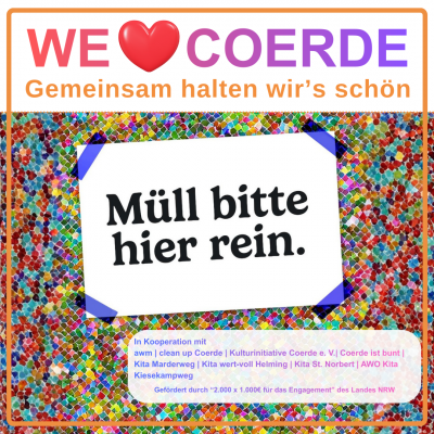 - We love Coerde – Gemeinsam halten wir´s schön!In der Aktion sind die unscheinbaren Metallabfallbehälter auf dem Spielplatz farbenfroh durch von Kinder gestalteten Bildern in Szene gesetzt worden, um für ein schönes und sauberes Coerde zu werben.